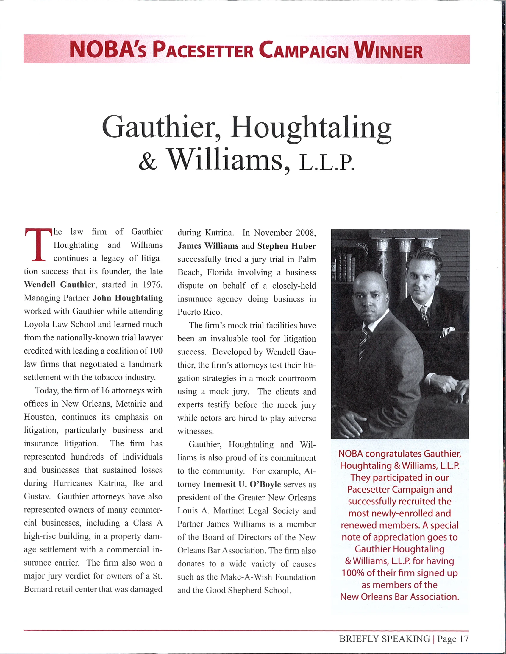 Elizabeth Barnwell January 13, 2017 NOBA's Pacesetter Campaign Winner Elizabeth Barnwell January 13, 2017 Managing Partner John Houghtaling continuing the legacy from nationally-known trial lawyer, Wendell Gauthier.